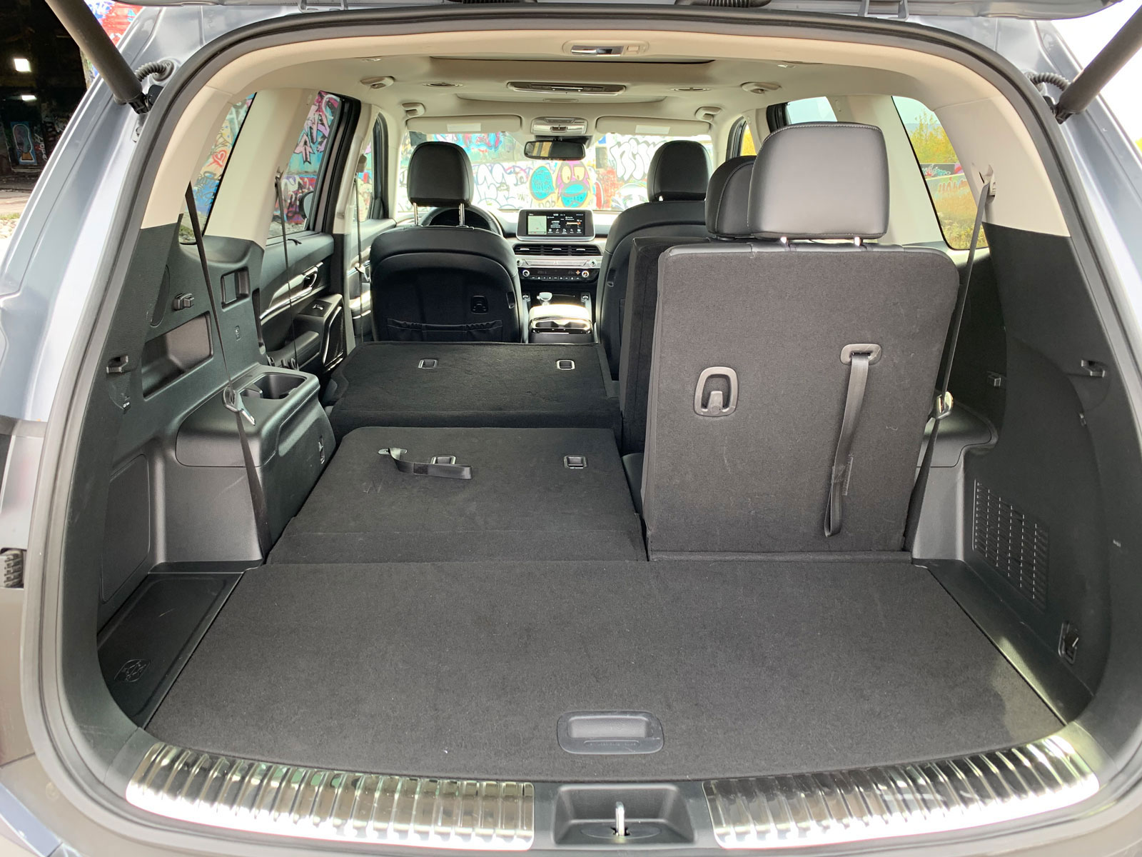 The exterior is quite unique with square amber daytime running lights in the vertical headlamps. The grille is thing and wide with the word Telluride printed above it for anyone who’d be wondering what this vehicle was. The rear fascia has a similar design incorporating inverted “L” tail lamps with LED stripes (standard on EX and SX trims) that curve into the tailgate. I would say Kia nailed it here with a rugged, yet pretty design that isn’t too boxy and screams toughness.